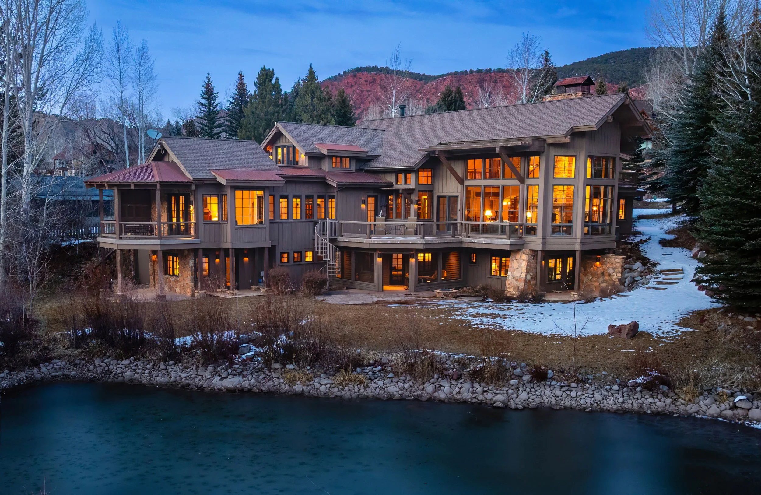 Own a section of the Roaring Fork River in Aspen Glen! There are just a handful of riverfront properties in this highly sought after Mid-Valley development and the only one with its own pond and water right! The home sits on nearly 2 acres and features 5 ensuite bedrooms, including a separate apartment with its own entrance. There is also a stately office, a meditation & exercise room, and not one but three garages. The voluminous main living area features views of the river from floor-to-ceiling windows and a spectacular two-story stone fireplace. The enormous primary suite is on the main level and provides its own sitting area and private deck. The open concept kitchen is a family focal point, with plenty of bar seating, an adjacent dining room, and a cozy lounge area around yet another fireplace. The home offers excellent separation for guests on the lower level with its own family room, kitchenette, and easy access to the patio and fire pit. There's even a fly fishing room! Tie your own bugs, pull on your waders, grab your rod, and step right into your very own stretch of Gold Medal water. Wildlife is abundant along the bank, where it's not uncommon to spot bald eagles. If landing trout is not your thing, head to the club for a round of golf at the Jack Nicklaus-designed course, or take in a game of pickleball, a workout at the fitness center, or a dip in the pool. Afterwards, enjoy dinner and drinks as you take in views of magical Mt. Sopris. Please note, club membership is optional and not provided as part of any sale. Great shopping, restaurants and local vibes are just down the road in Carbondale, Willits and Whole Foods are nearby too, and world-class skiing & snowboarding at Aspen/Snowmass and two regional airports are just a 45-minute drive. What else could you ask for? Don't wait! This one's a real ''Diamond on the River''.